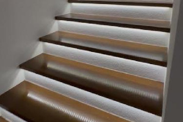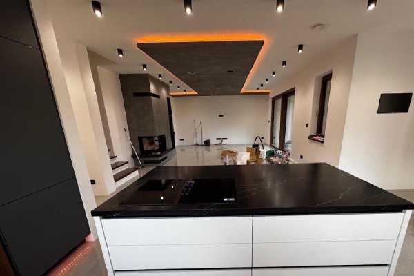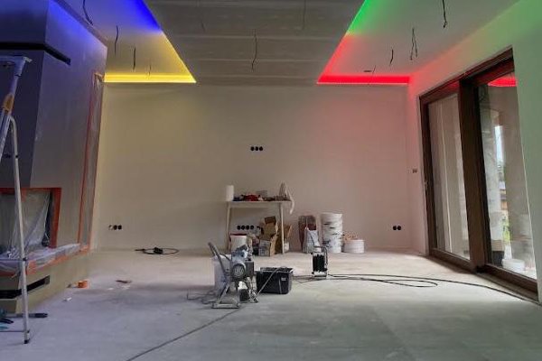 Dom má 32 samostatných svetelných okruhov — bodové svietidlá v klenbových podhľadoch, RGB pásy pod kuchynským ostrovom a barom, LED schodisko so sekvenčne spínanými stupňami, stropné LED svetelné rámy v kúpeľniach a spoločenských priestoroch a osvetlené výklenky v mramorových sprchách. Za stmievanie a PWM riadenie LED pásov sa starajú moduly 4DIM, LEDOC4 a dva LEDOC12.